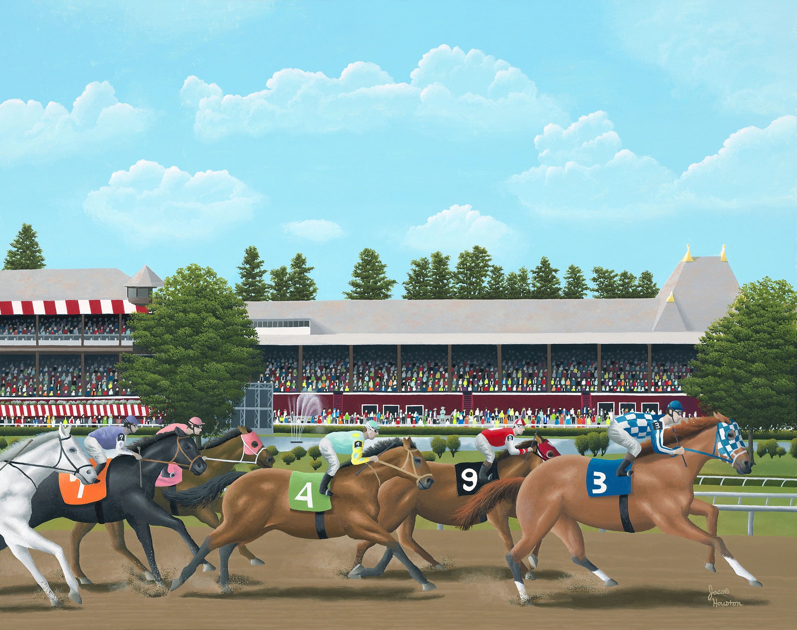 Secretariat, Seabiscuit, and American Pharoah as well as the Queen of England can be found in this fun painting, my first attempt at horse racing.