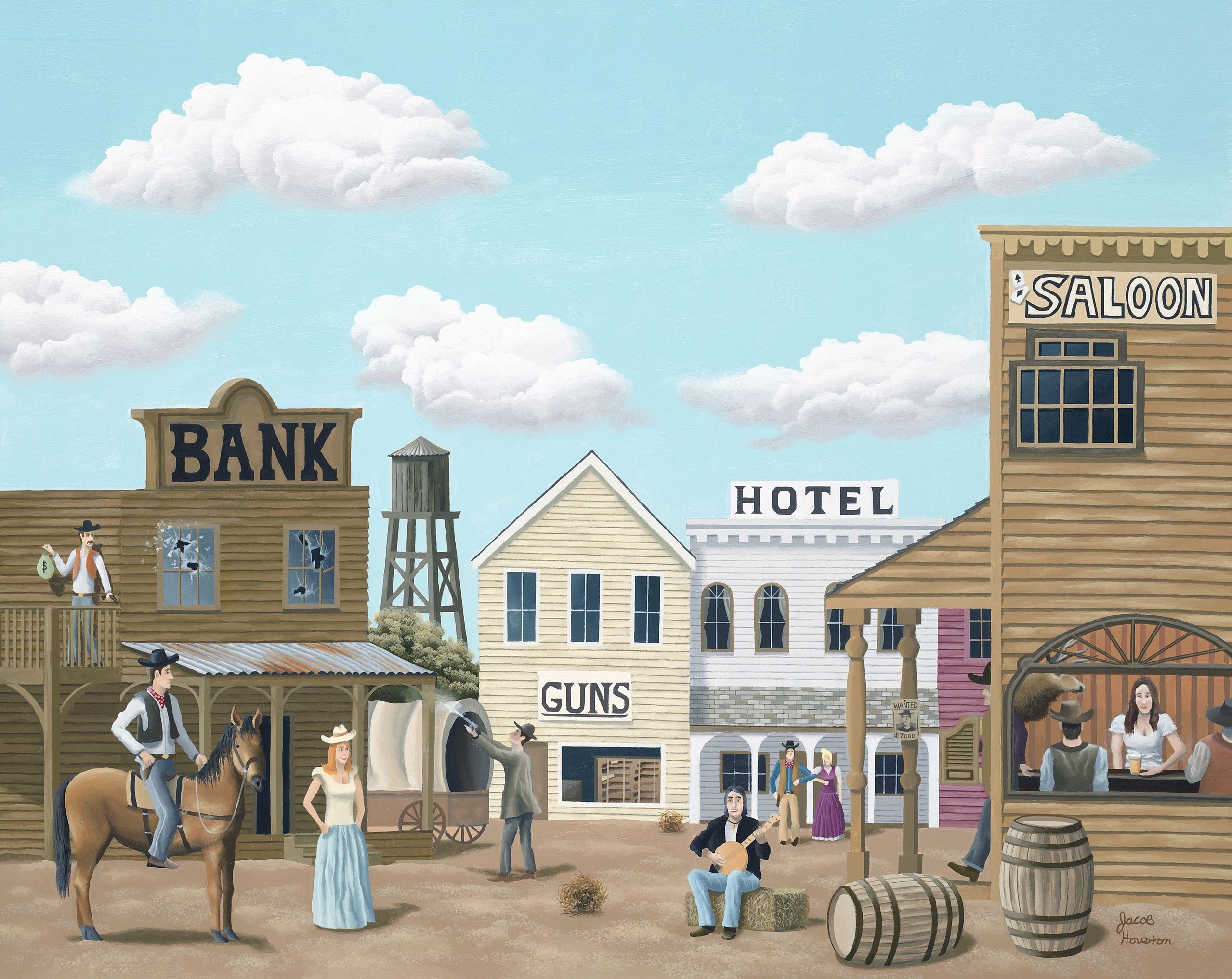 I had a great time creating this Wild West scene, including Hal Ketchum from my home town playing guitar, and my dear mom as the bartender.