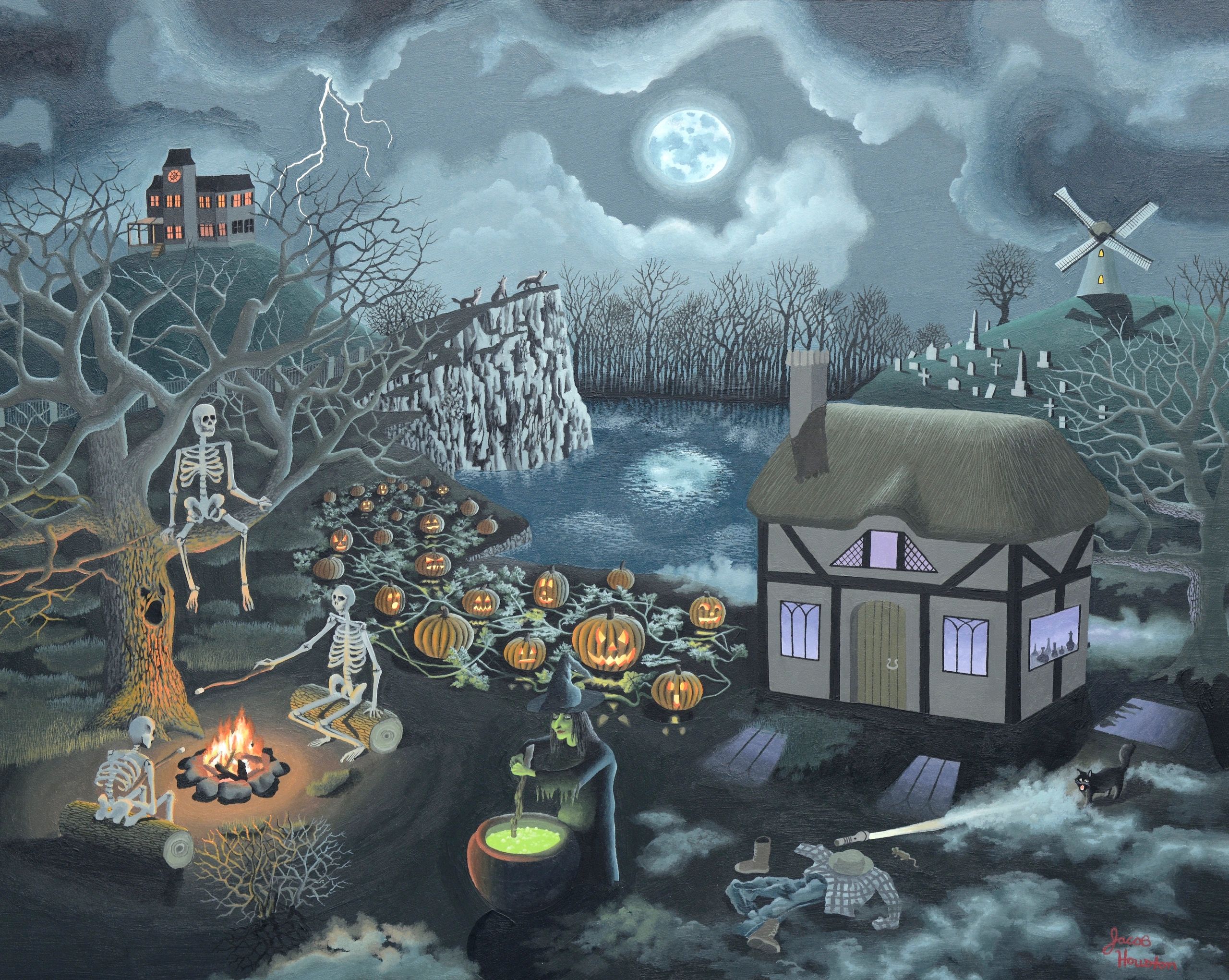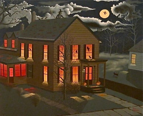 Almost a decade ago, a friend of mine commissioned me to paint her home as a scary haunted night scene. In moving recently, the painting was misplaced. So, she commissioned me yet again to paint the scene. As fate would have it, the day before she was scheduled to pick up the new painting, her husband found the original painting in storage. Coincidence, or are those witches and spirits at play??!! (A happy ending... both paintings found lovely homes.)