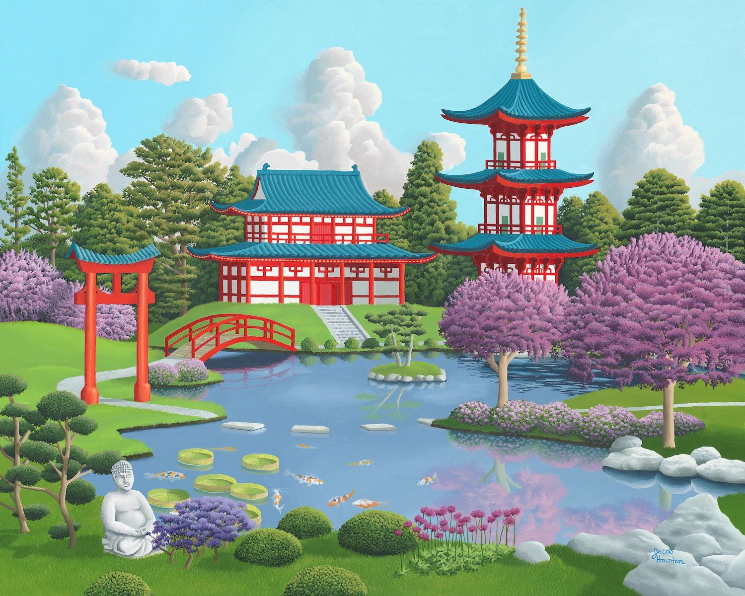I thought I would try painting some Japanese architecture and a garden, both firsts for me. Our friend who lives in Japan, Satomi, was helpful with advice on possible ideas that I could include in the painting. The koi fish were a fun addition...someday I may build a koi pond for myself.