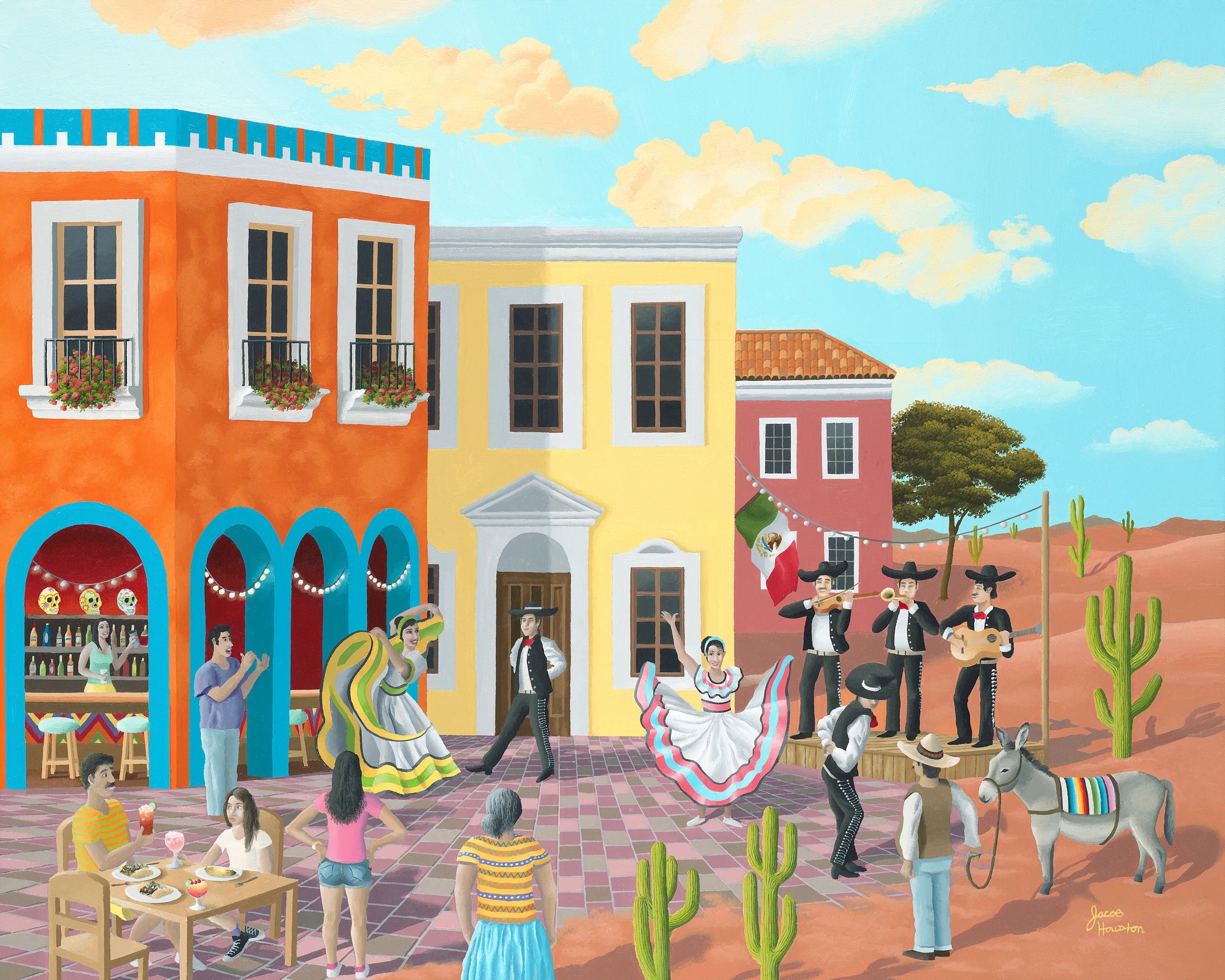 Pure happiness resonates from this joyful Mexican scene. I wanted to try some Mexican architecture as well as dancing people and a friendly donkey. Looks like a place I would like to visit one day...