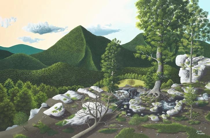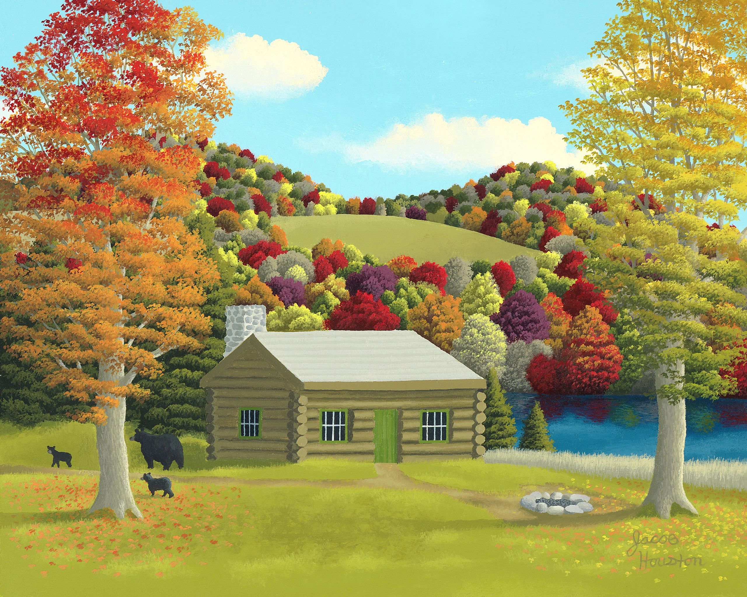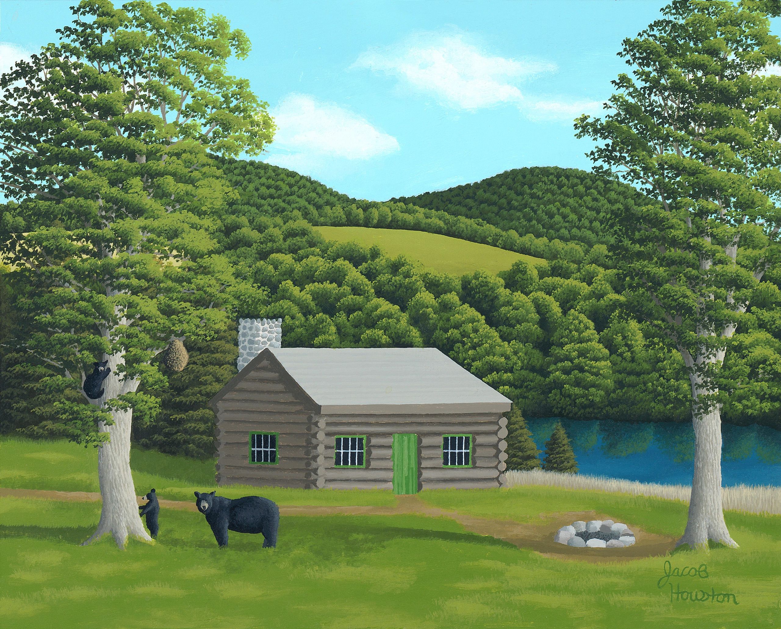 Driving across the Massachusetts Turnpike recently, boredom led my mind to wander, and into my head popped the vision of my next painting...a scene from one of the most beautiful states that I know, Vermont. Of course, there had to be magnificent mountains, rock outcroppings,, and a mama bear and her two cubs thrown in for good measure. (completed July 2016)