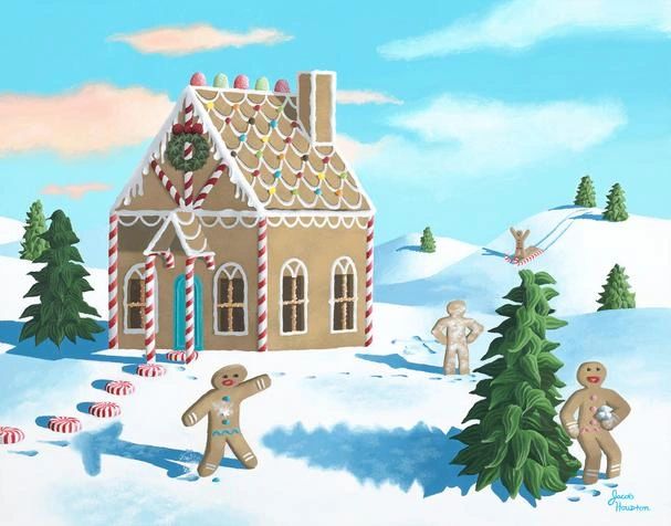 Just a happy Christmas scene with gingerbread men and ladies snowball fights, snow angel creations, and daring sled riding. I hope this makes you want to get a taste of the icing trees and scrumptious house!