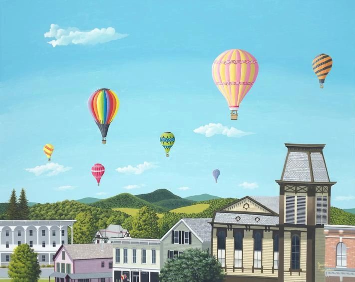 A balloon festival is held every year in the neighboring village of Cambridge, New York. The combination of the brilliant blue sky, the historic architecture of the village's buildings, and the vibrant colors of the balloons all combine to create a beautiful sight.