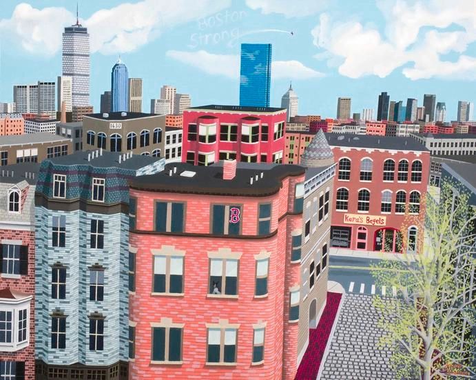Ironically, I had begun painting this before the attack at the Boston Marathon. In honor of the victims and the city of Boston, I added "Boston Strong" in the sky. (completed June 2013)