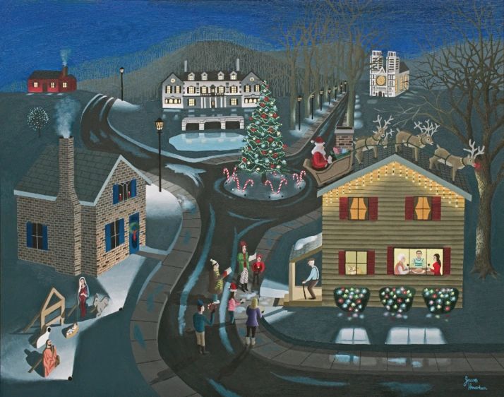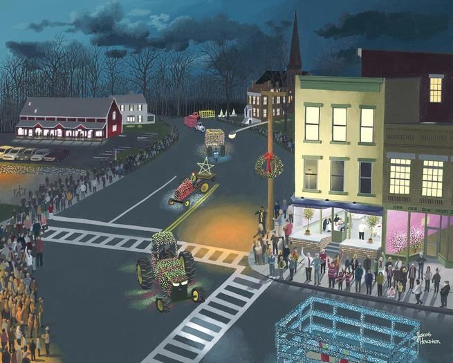 "Lighted Tractor Parade" featuring local farmers and businesses driving their tractors, wagons, and combines down Main Street. Each tractor is lit up with thousands of Christmas bulbs and many provide holiday music, making for a truly magical event. The small village draws thousands on people to this special festivity. I took the liberty of including many friends among the crowd of spectators. This painting won the Windsor & Newton Award at the 63rd Annual Exhibition of the National Society of Painters in Casein & Acrylic at the Salmagundi Club on 5th Avenue in Manhattan. (completed January 2017)
