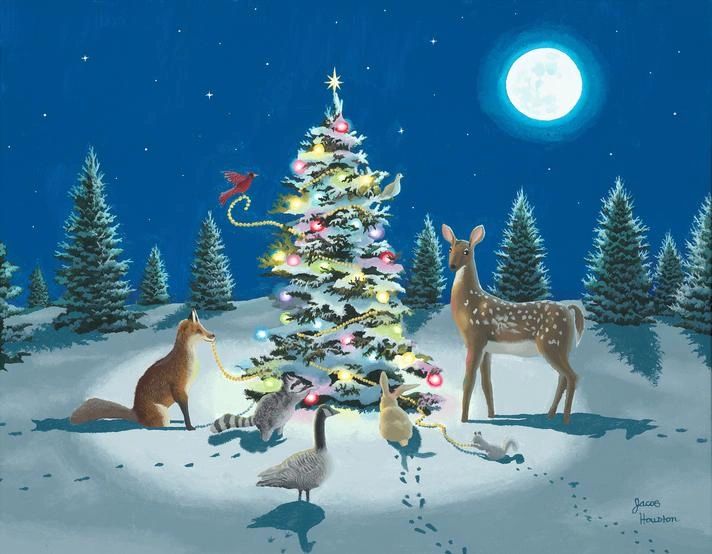 You guessed it- time for another Christmas card...this time I challenged myself by including several animals that I had never painted before. They are all busy getting their Christmas tree decorated on a crisp winter night. The deer seems to sense that someone is approaching. Wouldn't it be incredible to come upon this in real life? You never know!