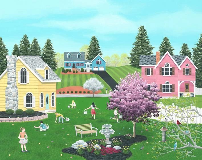 My extended family's annual Easter egg hunt has been a tradition since even before I was born. It has always been a great time with the older cousins charging around, trying not to knock down the unsteady toddlers in the pursuit of treasure. Everyone always seems to get a nice bounty of candy and other goodies. My Aunt Carol's home is in the background, but the rest came from my imagination.